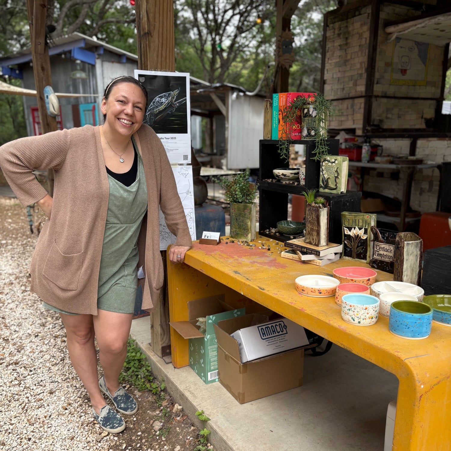 I’m a book-loving anthropologist, educator, and mom of two, making small-batch ceramics in San Marcos, TX. A Hill Country native and longtime San Martian, I work out of Eye of the Dog Art Center alongside a generous, talented community of local artists.